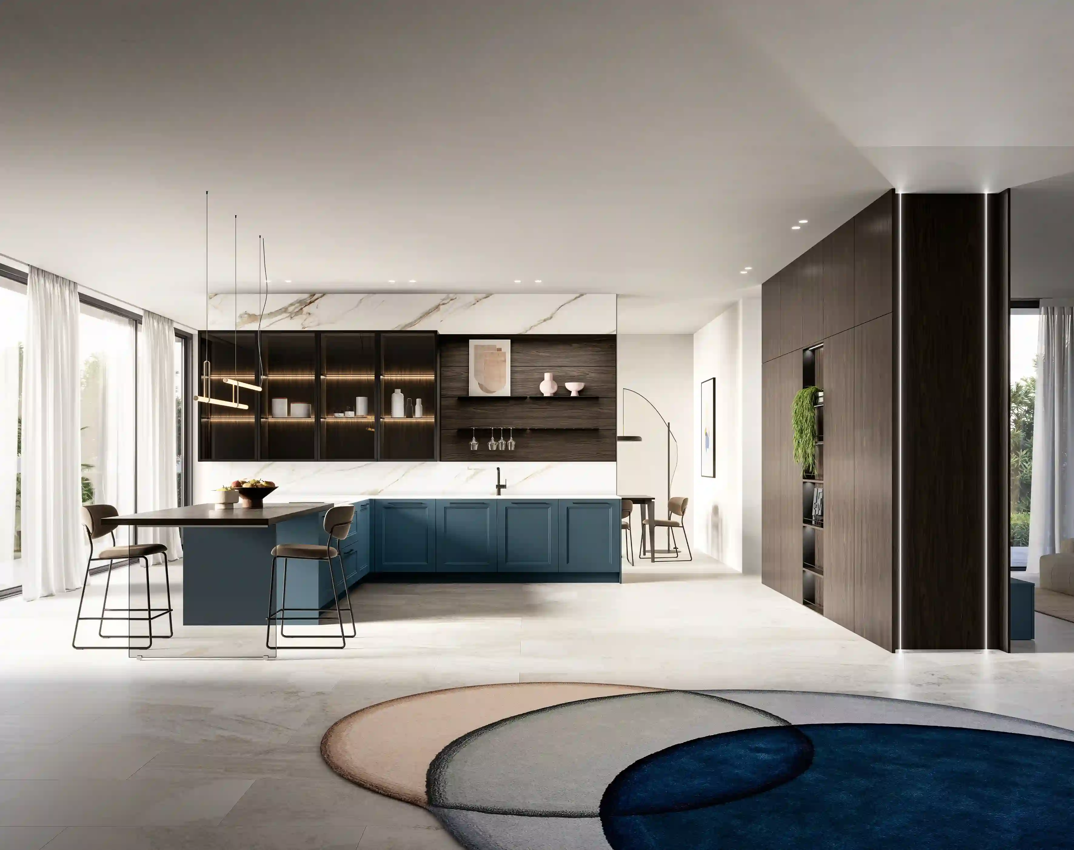 La cucina Meg, qui proposta in configurazione angolare, interpreta l’eleganza contemporanea con un equilibrio perfetto tra dettagli ricercati e funzionalità quotidiana. La composizione su due lati valorizza ogni centimetro, creando un layout avvolgente che facilita i movimenti tra le diverse zone operative e dona continuità allo spazio. L’anta a telaio, caratterizzata da un raffinato doppio bassorilievo, conferisce profondità e personalità, mentre la versione con telaio in massello e vetro amplifica la luminosità e aggiunge un tocco scenografico. Una cucina pensata per chi cerca un progetto elegante e ricercato, capace di coniugare estetica, comfort e una perfetta gestione dello spazio.