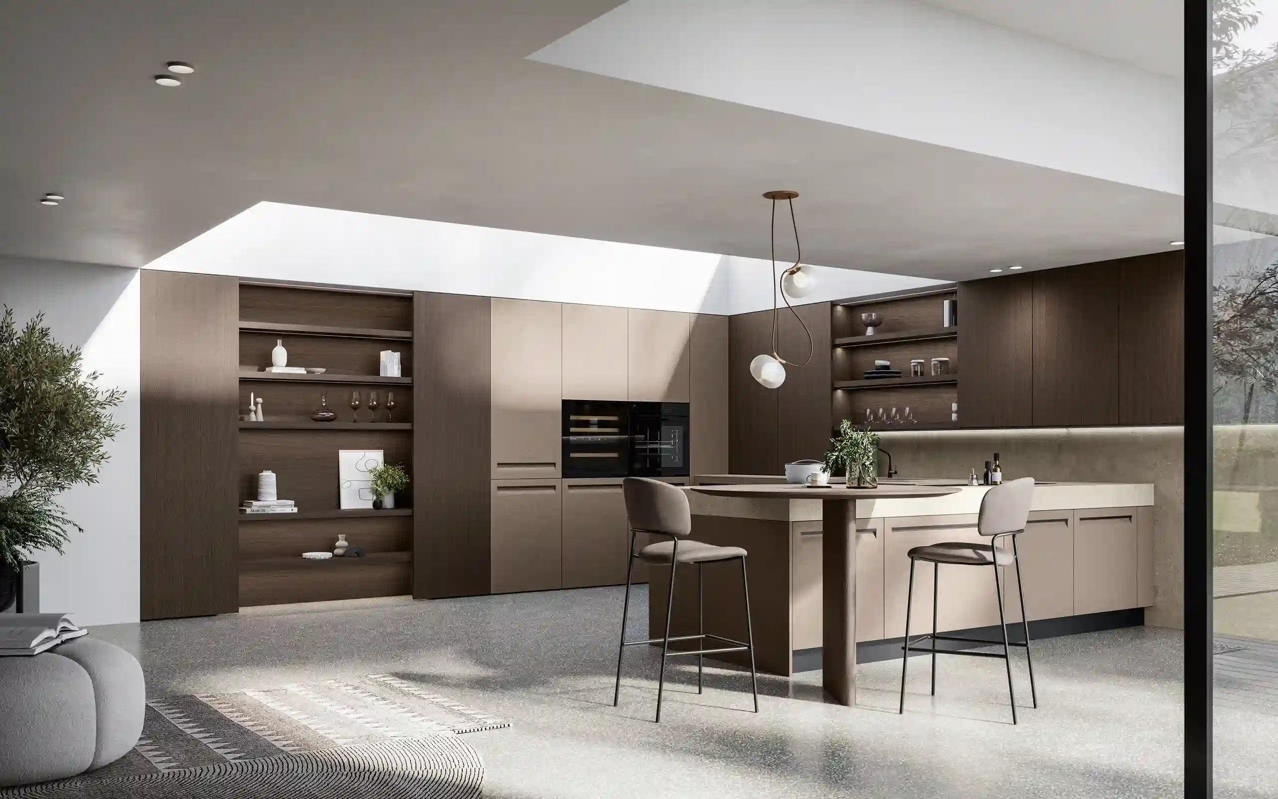 La cucina Tekna, proposta in versione angolare, celebra il design essenziale attraverso un dettaglio che definisce l’intero progetto: la maniglia integrata direttamente nell’anta. Il pannello viene scavato con precisione e rifinito con un listello metallico, trasformando la presa in un gesto naturale e garantendo un’estetica continua, pulita e sofisticata.