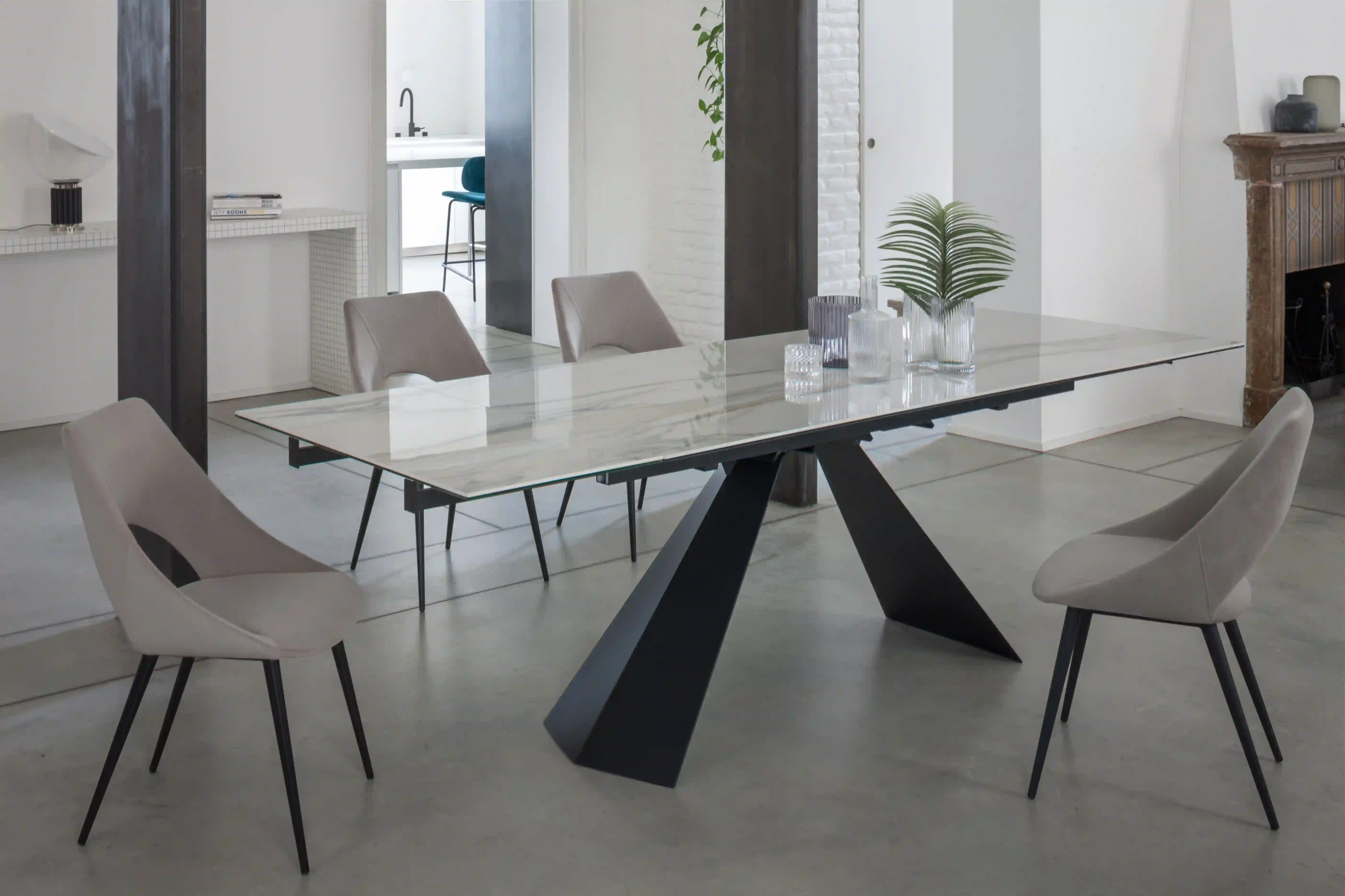 Il tavolo Ragnar Ceramico Plus unisce design contemporaneo, materiali pregiati e funzionalità. Il piano in vetro ceramica, lucido o opaco, è disponibile nei raffinati colori Calacatta oro e Thunder night, mentre la base in metallo nero garantisce stabilità e modernità.